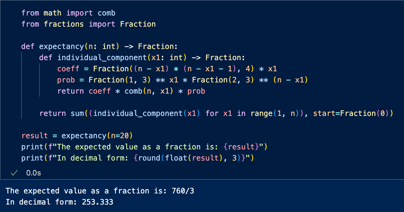 Let’s play a game… We’re going to roll a d3 (a fair, 3-sided die) 20 times, record the frequencies that each face value that shows up and take the product of said frequencies. What’s the expected value of such a game?