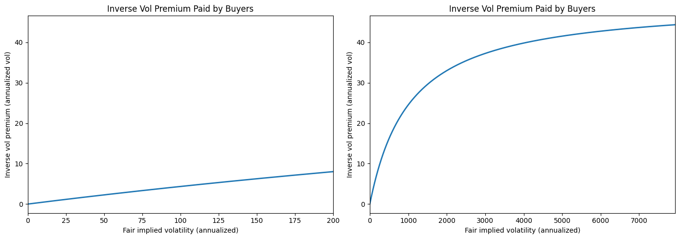 Hopefully it’s clear that that this premium changes as a function of implied vols of mid on the x-axis as different vols make it be viable to be 94.5 cents depending on the log moneyness of the contract with two minutes left. I included the graph on the right with unrealistically high vols to illustrate the concavity of this “premium”, because it looked too close to linear for more realistic vol numbers.
