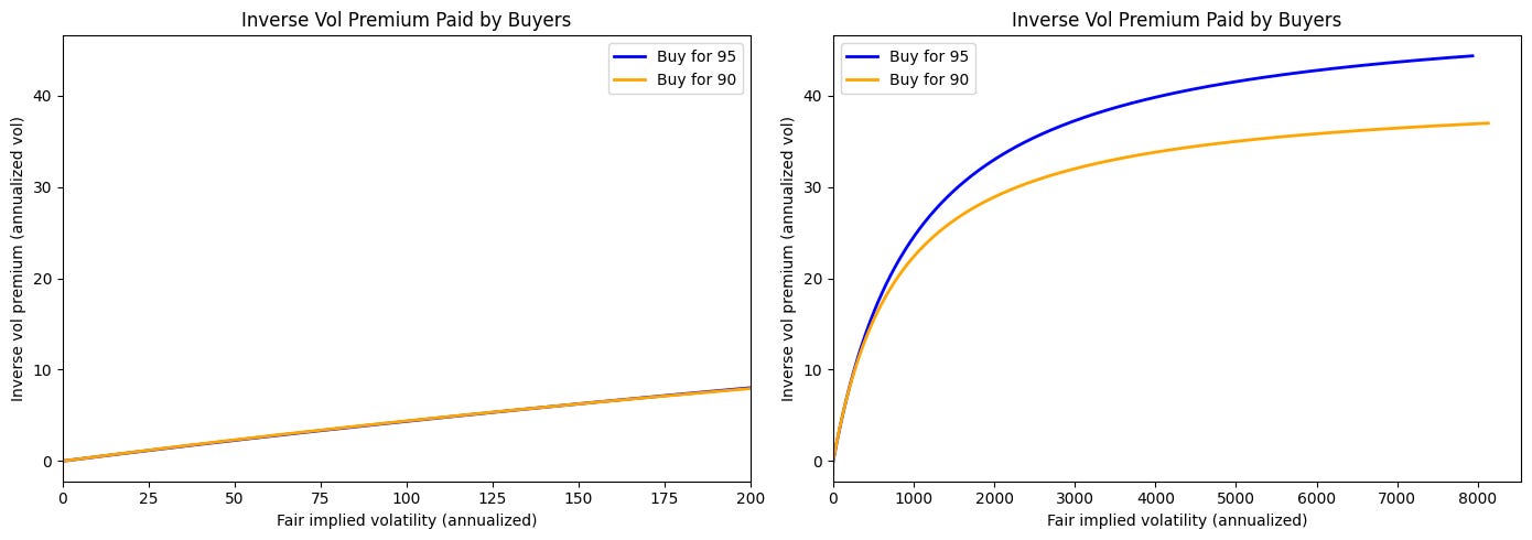The EV is worse despite the vol difference being less for the buy for 90 strategy though given that fees are directly proportional to variance and a Bernoulli with p=0.9 has higher variance than p=0.95.